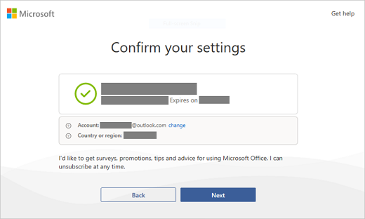 If you see the Confirm your settings, select Next. And the Success! opens to notify that your Office product is linked in your Microsoft account successfully. And then select Get started.
