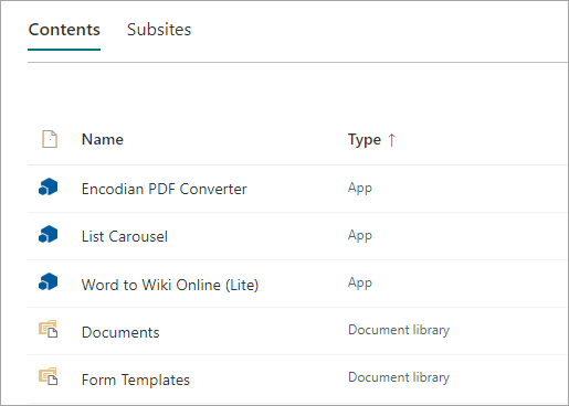 6. After you've installed an app, you can find it in the Site contents page. Go to Settings Office 365 Settings button, select Site contents, and your app will be listed. You can sort the Type column on A-Z to help make Apps easier to find.