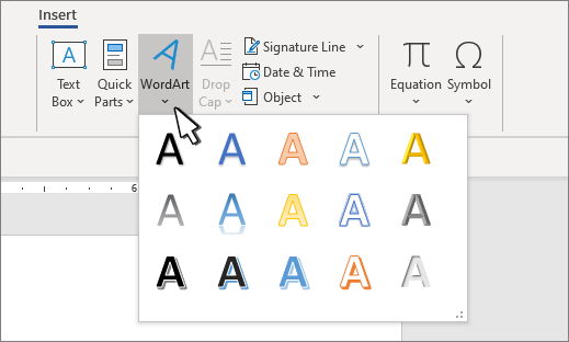 Note: The WordArt icon is located in the Text group, and it may appear different depending on the version you're using and the size of your screen. The icon may also look like this Small WordArt icon or Medium WordArt icon.