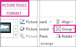Click the Shape Format tab or the Picture Format tab, and then click Group > Group.