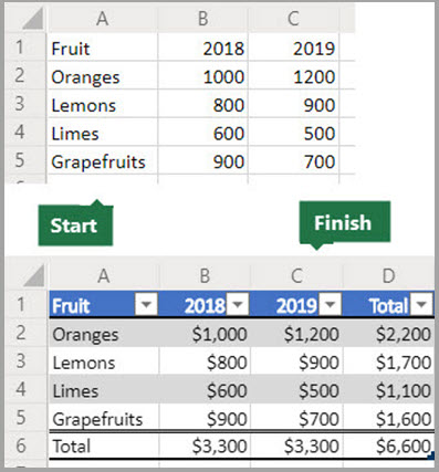 2. To create a new Office Script, select Create from Recording, then start taking the steps you want to automate. For this example, we're taking a data range, converting it to an Excel table, adding a total column and total row, and finishing by formatting our values as currency.