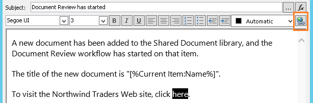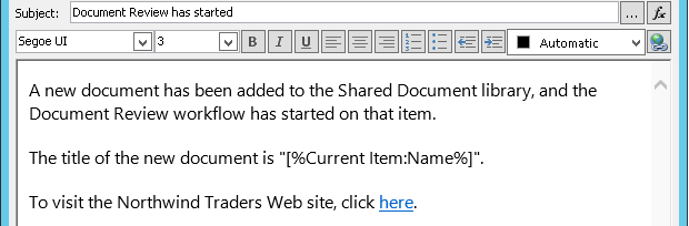 So far, the body text in the example email is static: Every time the workflow creates an instance of the email, the text will be exactly the same.