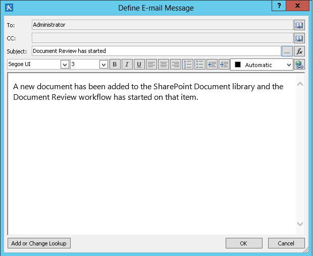It can be useful, however, to include text that changes in relation to the item on which the workflow is currently running. For example, it might be useful to include the title of the document needing review in the body of your email. To include this sort of dynamic information, you use a workflow lookup. Lookups retrieve data from different data sources such as lists, libraries, and workflow data.