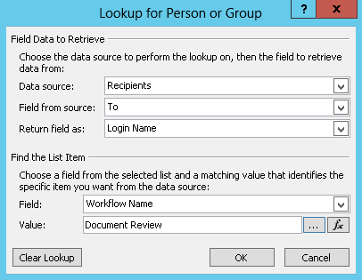 This lookup states, "From the Recipients list, select the value of the To field where the Workflow Name equals Document Review."