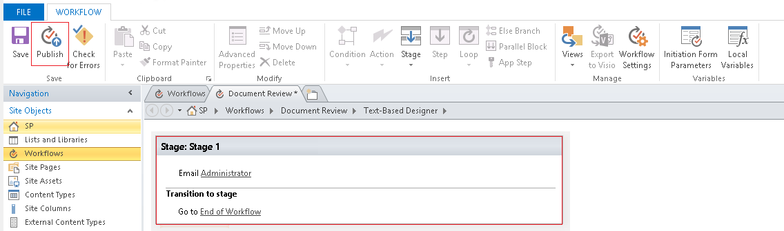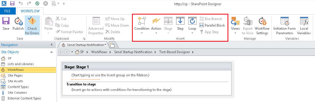 Now that the workflow is created, you can add Actions, Conditions, Stages, Steps and Loops to build your workflow. These workflow components are available in the SharePoint Designer 2013 ribbon.