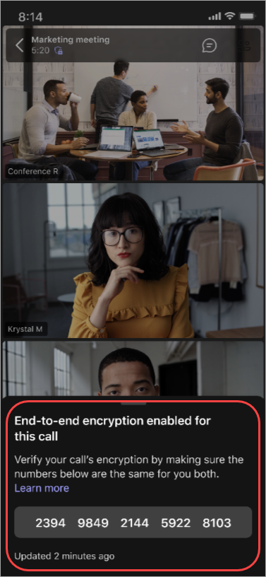 During an end-to-end encrypted meeting, features including recording, live captions, transcription, together mode, large meetings, large gallery view on desktop, and PSTN aren't available.