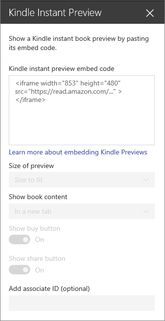 Have a book you want to recommend or promote on your page? You can easily share a preview of a Kindle book using the Kindle instant preview web part. To use this web part, you'll need to get the embed code of the book you want to preview. To learn how to do that, see the Kindle instant preview site.
