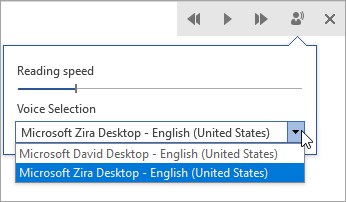 screenshot of the Immersive reader voice options toolbar. The mouse hovers over settings revealing a toggle for reading speed and dropdown for voice selection