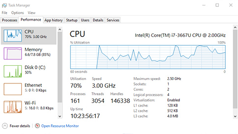 When the Task Manager window opens, select the Performance tab at the top of the window, and then make sure CPU is selected.